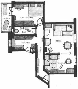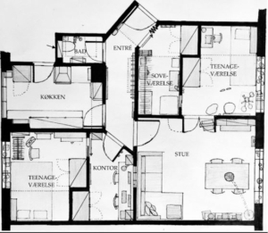EKSEMPEL: Hos denne familie i en ældre københavnerlejlighed fungerer det praktiske dårligt, og det tager meget opmærksomhed i hverdagen (men er svært og dyrt at lave om på). Køkkenet mangler opbevaringsplads, fordi det består af skæve vinkler, få store vægflader og en masse gangareal. Entréen mangler også opbevaringsplads, fordi den lige netop er for smal til at etablere det. I stedet optager entréen nu mange ubrugelige kvadratmeter. Badeværelset er også for smalt og mangler derfor både vaskeplads og en reel bruseniche. I stedet fylder tørrestativet i soveværelset, og badeværelsets gulv bliver vådt at gå på.